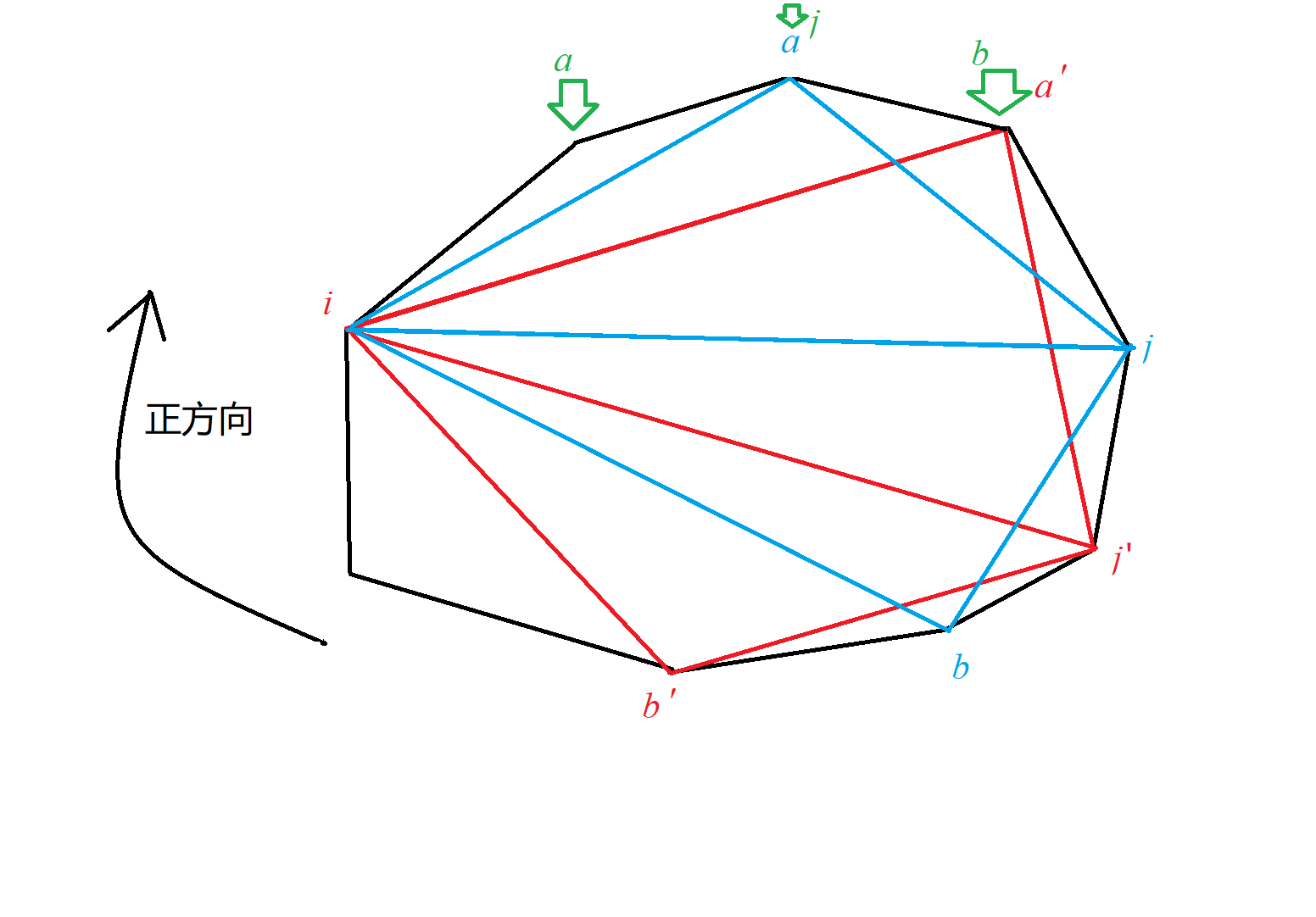 考虑按照顺时针(图中的正方向)枚举端点,,当移动到下一个位置的时候,考虑,的移动,发现,都是沿着正方向移动,于是单调地移动,,直到面积不增加才停止。